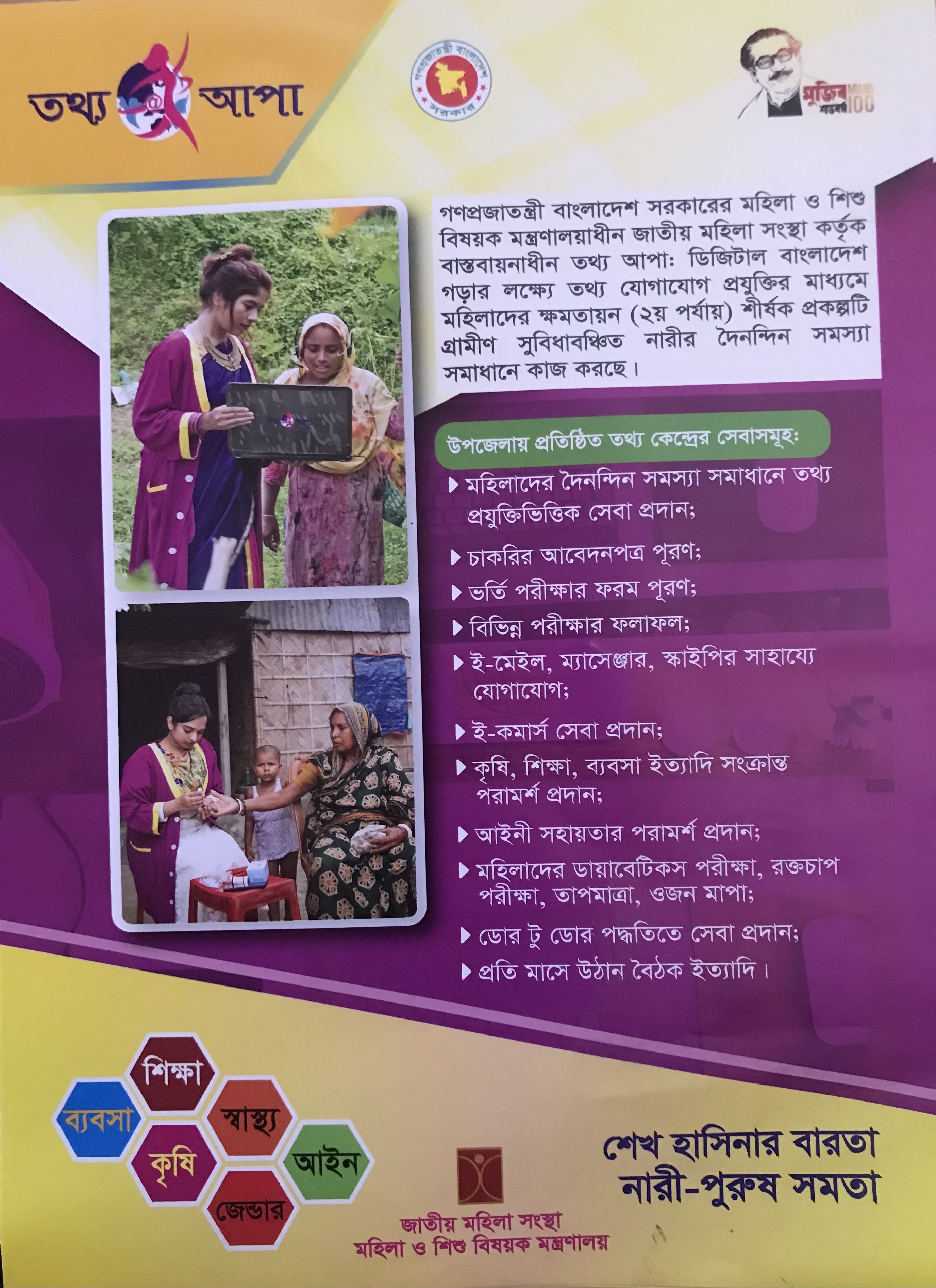 উঠান বৈঠক ও মুক্ত আলোচনা এর মাধ্যমে গ্রামীণ মহিলাদের জীবন ও জীবিকা সম্পর্কিত বিভিন্ন বিষয় যেমন- স্বাস্থ্য সমম্যা,বাল্য বিবাহ, ফতোয়া, নারীর বিরুদ্ধে সহিংসতা, চাকুরী সংক্রান্ত তথ্য, আইনগত সমস্যা এবং ডিজিটাল সেবা সমূহের নানাদিক সম্পর্কে অবহিত করা ।